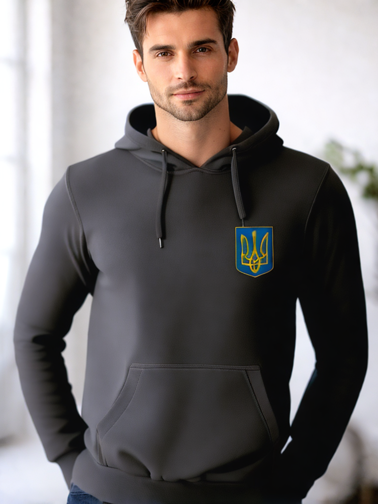EN: Subtly Ukrainian. The small trident in blue-yellow shield on the chest - subtle but clear. For those who want to show their support quietly and stylishly.